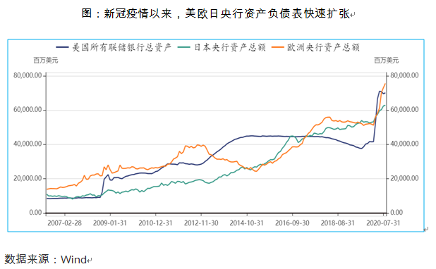 这次疫情导致美联储、欧洲和日本央行都开启资产购买计划,给市场兜底。截至2020年6月底,美联储总资产7.08万亿美元,日本央行总资产6.03万亿美元,欧洲央行总资产7.02万亿美元,三个央行总资产都出现快速上升趋势。