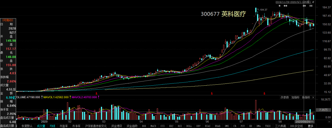 从股价表现来看,自7月15日创下184.37元每股的阶段高点后,英科医疗股价便陷入震荡回调阶段,截至周二收盘报148元每股。