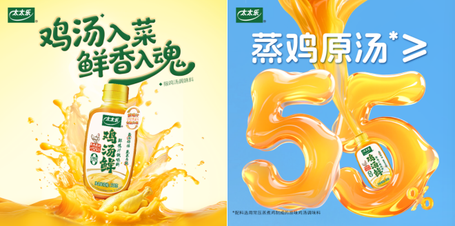 针对消费者烹调用盐量的需求变化,太太乐精准推出薄盐鸡精。该产品钠含量较醇鲜鸡精降低25%,但鲜美指数仍高达2.3,真正实现“减盐不减鲜”,成为健康饮食趋势下的明星产品。此前,太太乐鲜鸡汁产品包装升级为鸡汤鲜调味料,蒸鸡原汤含量提升至≥55%,较旧版提高5个百分点,进一步强化“新鲜”的核心诉求。