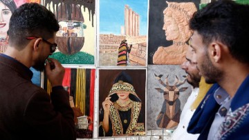 4月14日,在也门首都萨那,人们参观艺术展上的画作。4月14日,也门首都萨那举办艺术展,展出了约15…