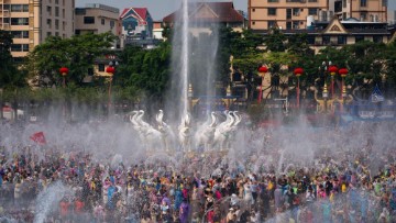 4月15日,人们在泼水广场参加泼水狂欢活动。4月15日,云南省西双版纳傣族自治州迎来一年一度的泼水狂…