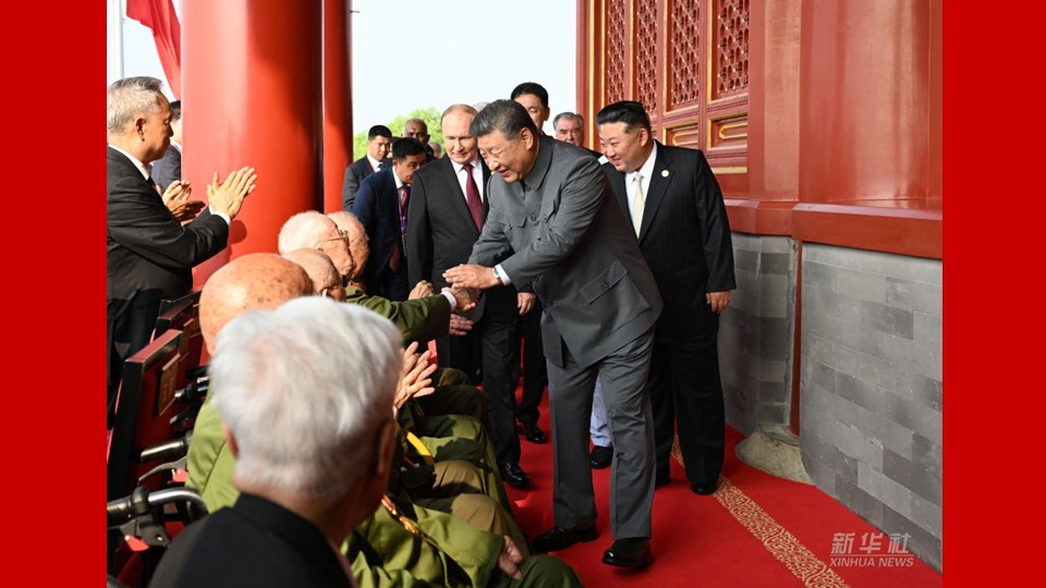 新华图讯丨习近平登上天安门城楼 同抗战老战士老同志代表亲切握手