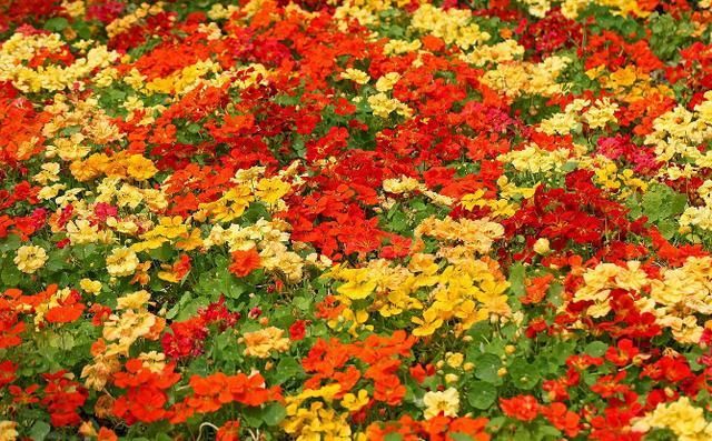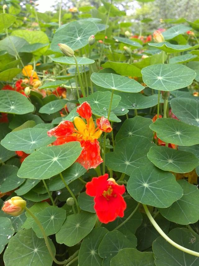 金莲花,又叫做旱金莲,大概很多朋友没有听说过它,实际上它是一种多年生的草本植物,可以盆栽放在阳台上,可以直接地栽种在花园里,不过当作两年生花卉来栽培,繁殖方式就是用种子播种,它的花色也很多,各种各样,有鲜艳的橘红色,紫红色,橙黄色,还有淡雅的乳白色,以及混色,等等至少有五种颜色。