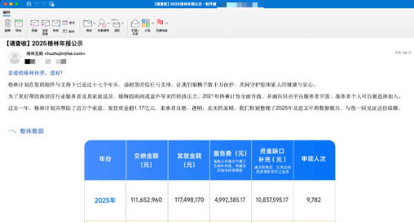 4月15日,贝壳向平台内的241,434位格林计划成员一对一发送了2025年格林年报。年报显示,2025年格林计划共发放金额117,498,170元,全年累计申领9,782人次。