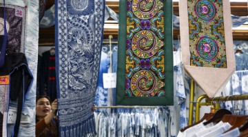 侗族妇女陆雪莲在肇兴侗寨制作一幅靛染作品(4月21日摄)。在贵州省黎平县肇兴侗寨等侗族聚居区,靛染、…